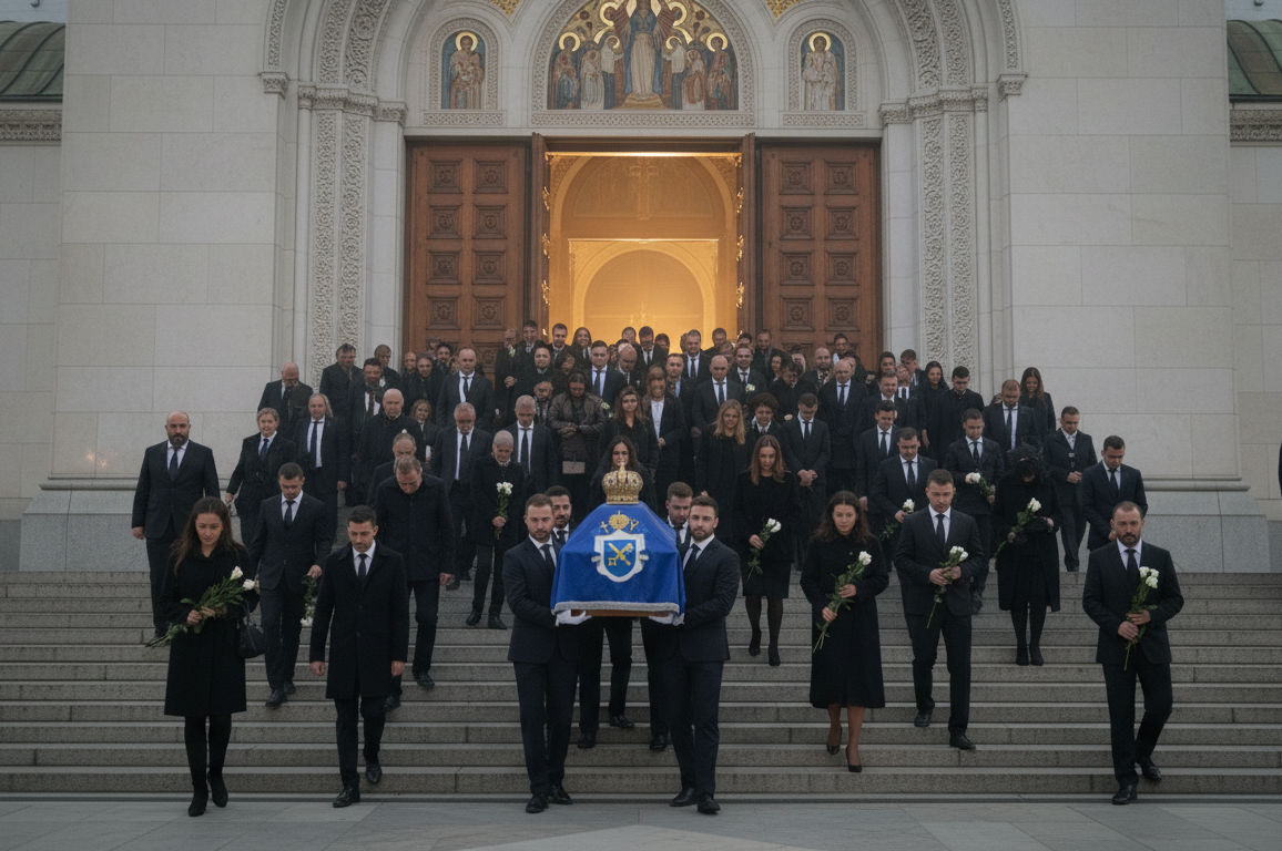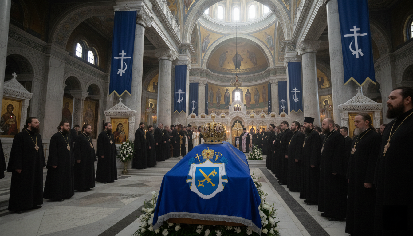 • Die Reihen von Gläubigen, Geistlichen und Würdenträgern sind bereits eingenommen. Am Ende der Kathedrale, vor dem zentralen Altar, ruht ein schlichter hölzerner Sarg, der die sterblichen Überreste von Patriarch Lazar birgt, bedeckt von einem dunklen, feierlichen Tuch, auf dem sein persönliches Wappen prangt.
