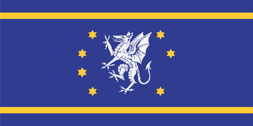 Die Flagge des Königreichs Albernias (The Dragon Banner) zeigt einen silbernen Drachen (#f5f5f5) auf albernisch-blauem Feld (#303c90), umgeben von sieben goldenen, sechsstrahligen Sternen (#ffcc33), die die sieben Kardinaltugenden symbolisieren. Oben und unten wird das Feld von goldenen Streifen begrenzt. Das Seitenverhältnis beträgt 1:2.
