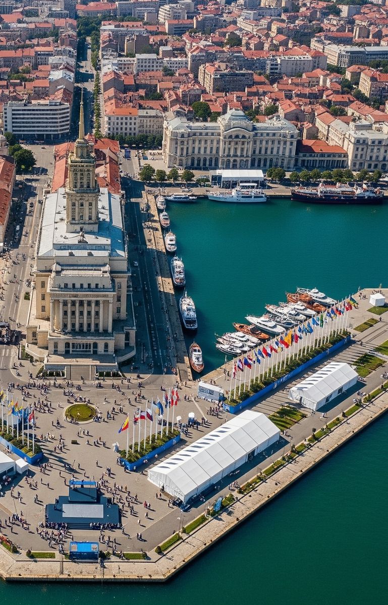 Auch der Hafen selbst präsentiert sich im festlichen Gewand: Von Masten und Kais hängen Wimpelketten, die sich wie symbolische Brücken zwischen den Schiffen spannen. Die Schiffe, teils Staatsyachten, teils zivil geschmückte Fähren, sind sorgfältig aufgereiht, als würden sie Spalier stehen. Entlang der Mole flanieren Besucher, Delegierte und Journalisten; man spürt, dass hier Geschichte geschrieben werden soll. Die Architektur ringsum – großbürgerlich, teils klassizistisch – verleiht dem Ganzen eine Aura von Dauer und Bedeutung.