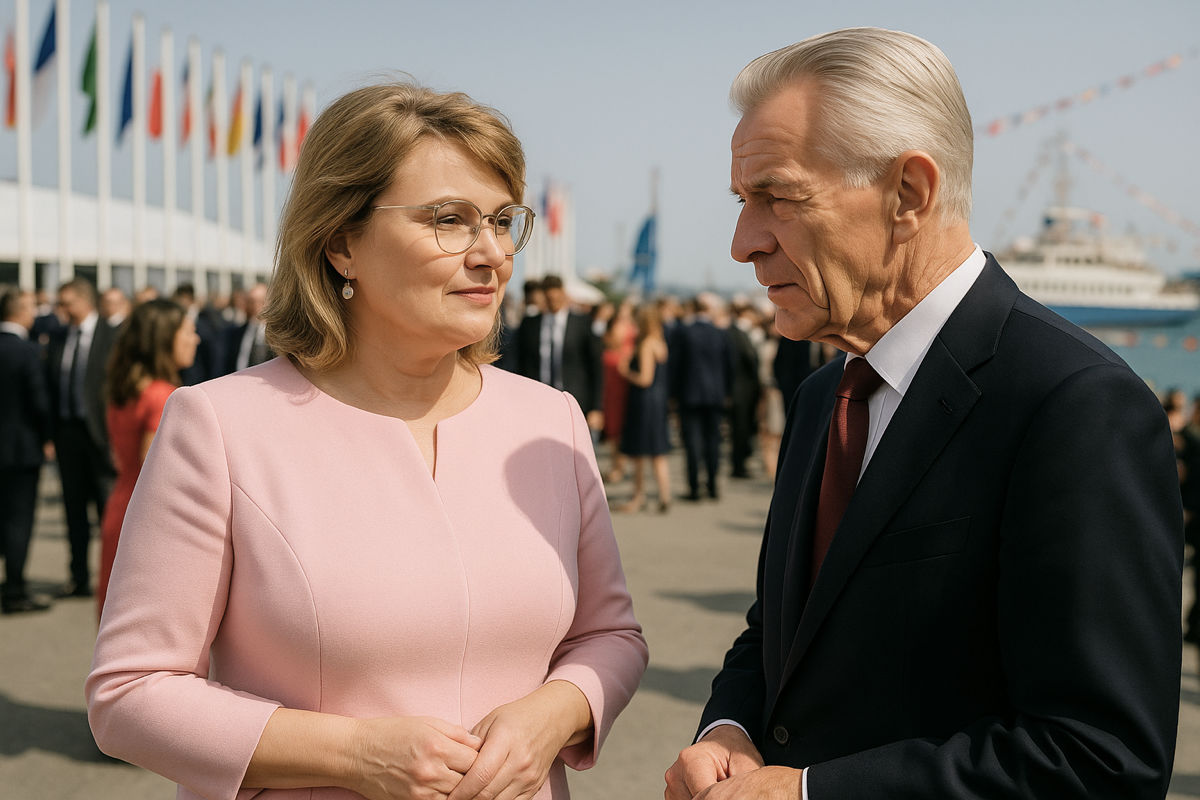 Auch der Hafen selbst präsentiert sich im festlichen Gewand: Von Masten und Kais hängen Wimpelketten, die sich wie symbolische Brücken zwischen den Schiffen spannen. Die Schiffe, teils Staatsyachten, teils zivil geschmückte Fähren, sind sorgfältig aufgereiht, als würden sie Spalier stehen. Entlang der Mole flanieren Besucher, Delegierte und Journalisten; man spürt, dass hier Geschichte geschrieben werden soll. Die Architektur ringsum – großbürgerlich, teils klassizistisch – verleiht dem Ganzen eine Aura von Dauer und Bedeutung.