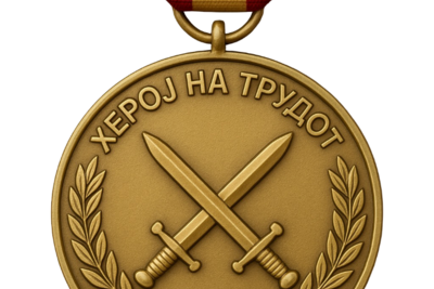 (2) Die Medaille trägt die Inschrift „Херој на трудот“ und zeigt in ihrer Mitte einen gekreuzten Hammer und eine Schreibfeder als Symbol der Einheit von körperlicher und geistiger Arbeit, umschlossen von einem Lorbeerkranz. Sie ist goldfarben ausgeführt und wird an einem rot-gelben Band getragen. Gestaltung und Symbolik sollen die Werte der Volksrepublik Pelagonien widerspiegeln und die beispielhafte Tatkraft der Geehrten sichtbar machen.
