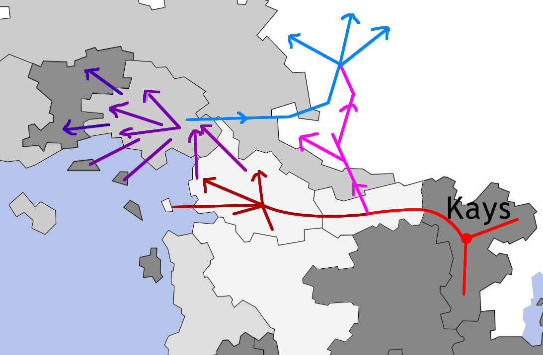 Von Rechts nach Links war es das alte Drull-Kaya führet weiter zum späteren kaysteranischen Caya. Hier ging es weiter (dunkelrote Pfeile) Richtung Kaysteran während sich die pinken über das chinopische Bergland nach AiP weiterbewegten. Dann weiter nach Vesteran (lila Pfeile) Richtung Usitien (dunkel-lila Pfeile) und wiederum Aufteilung Richtung AiP (blaue Pfeile).