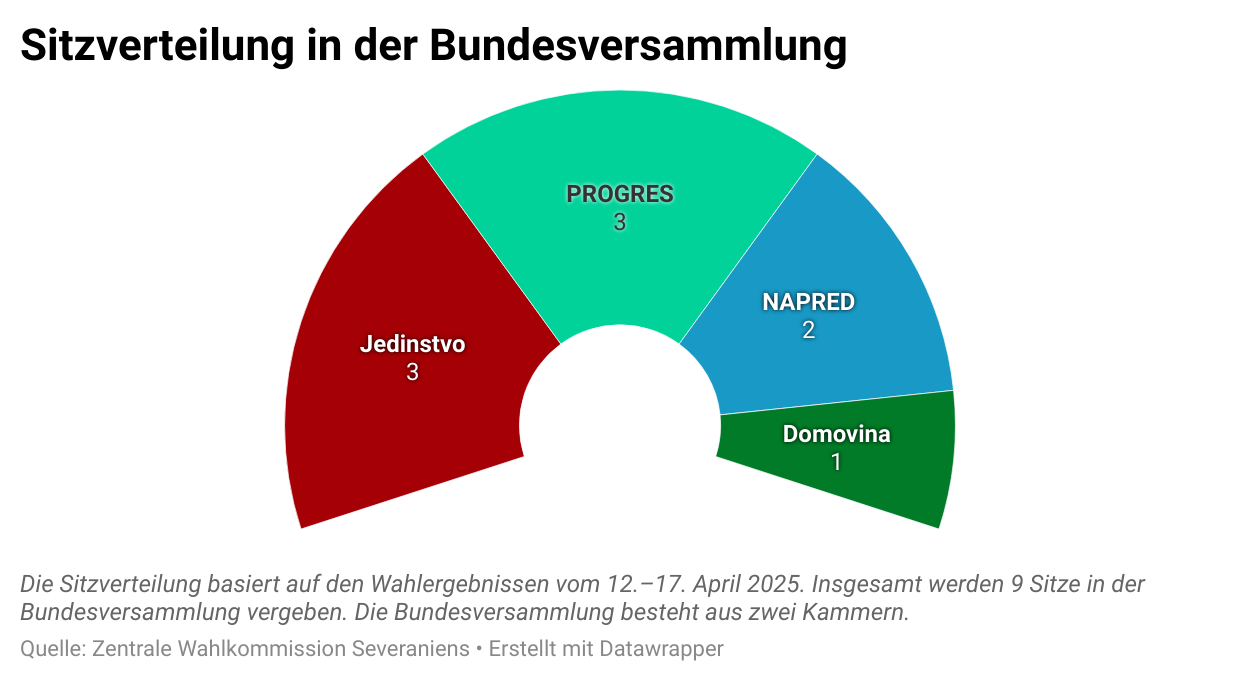 Die Sitzverteilung in der aus zwei Kammern bestehenden Bundesversammlung stellt sich insgesamt wie folgt dar: Jedinstvo 3 Sitze, PROGRES 3 Sitze, NAPRED 2 Sitze, Domovina 1 Sitz.