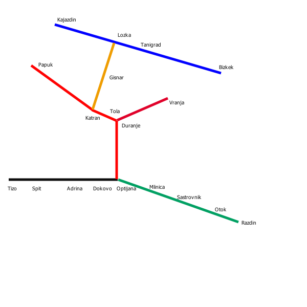 Optijana bis Razdin (Grün) - Linie 7, Zugverkehr im 30 Minuten-Takt