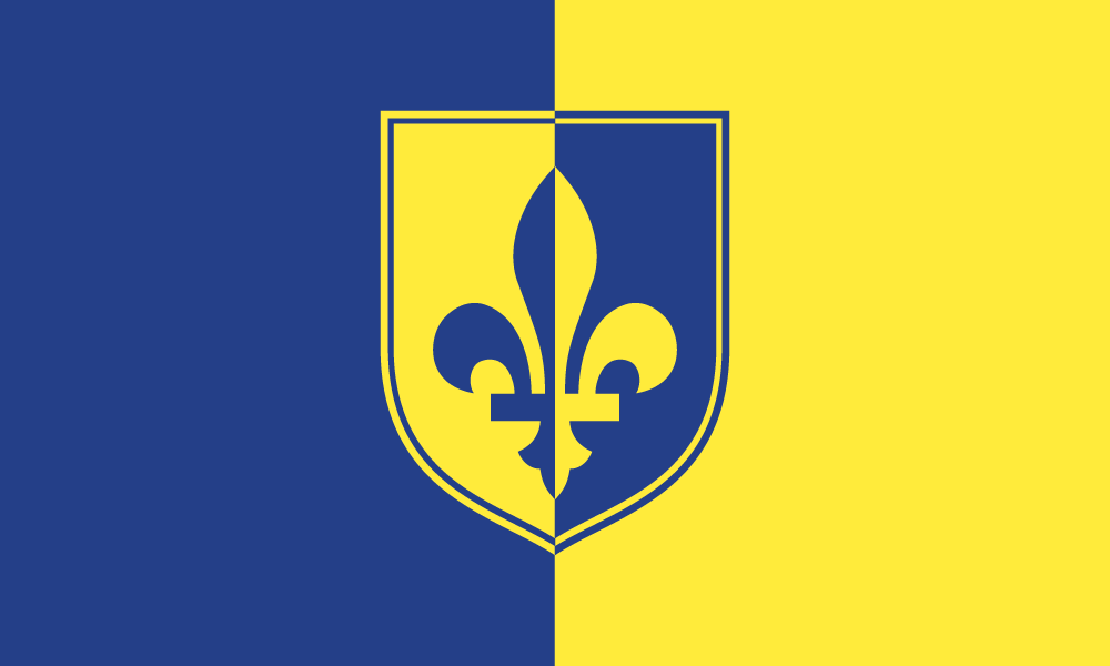 - Oblast Aresinje: Seitenverhältnis 3:5, rechts ein dunkelblauer, links ein goldgelber Streifen, mittig ein geteiltes Wappen mit der aressinischen Lilie