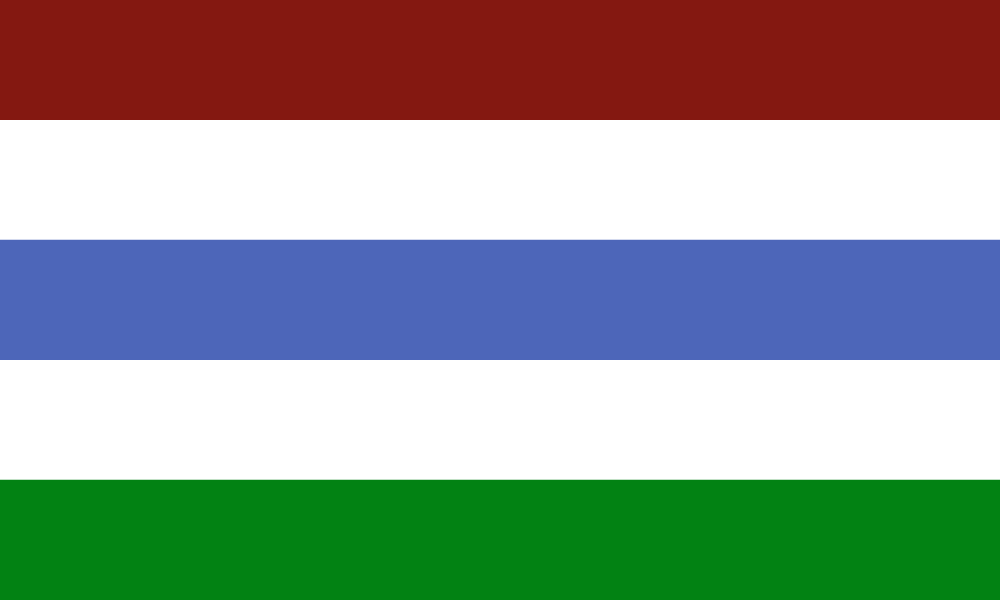 - Oblast Zvonik: Format 3:5, fünf horizontale Streifen. Oben Rot Vesterans, gefolgt von Weiß. Der mittlere Streifen zeigt den Mittelton zwischen Vesteran- und Aressinienblau. Darauf Weiß, abgeschlossen durch das aressinische Grün.