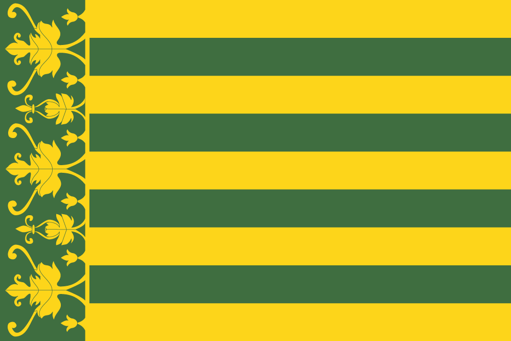 Sie besteht aus neun waagerechten Streifen, die sich gleichmäßig über die gesamte Flaggenhöhe verteilen. Jeder Streifen hat exakt 1/9 der Gesamthöhe. Die Streifenfarben wechseln ab – beginnend mit Gold oben – zwischen Gold (#ffd50e) und Grün (#406e40). Daraus ergeben sich fünf goldene und vier grüne Streifen.
