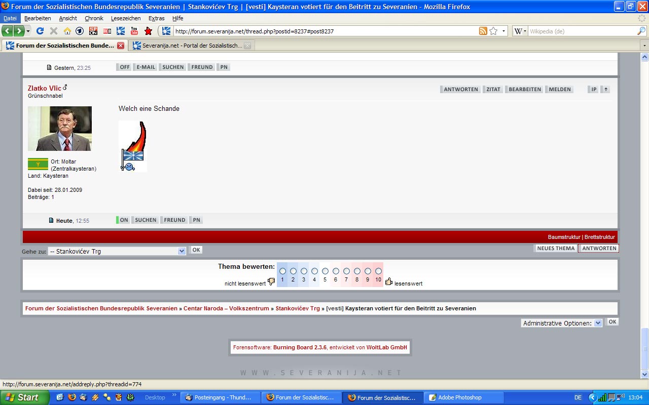Hiermit zeige ich Herrn Zlatko Vlić, wohnhaft in Moltar (Kaysteran), an wegen staatsfeindlicher Hetze und Volksverhetzung, §§ 14, 15 Nr. 2 StrafGB durch Entzünden einer severanischen Flagge.