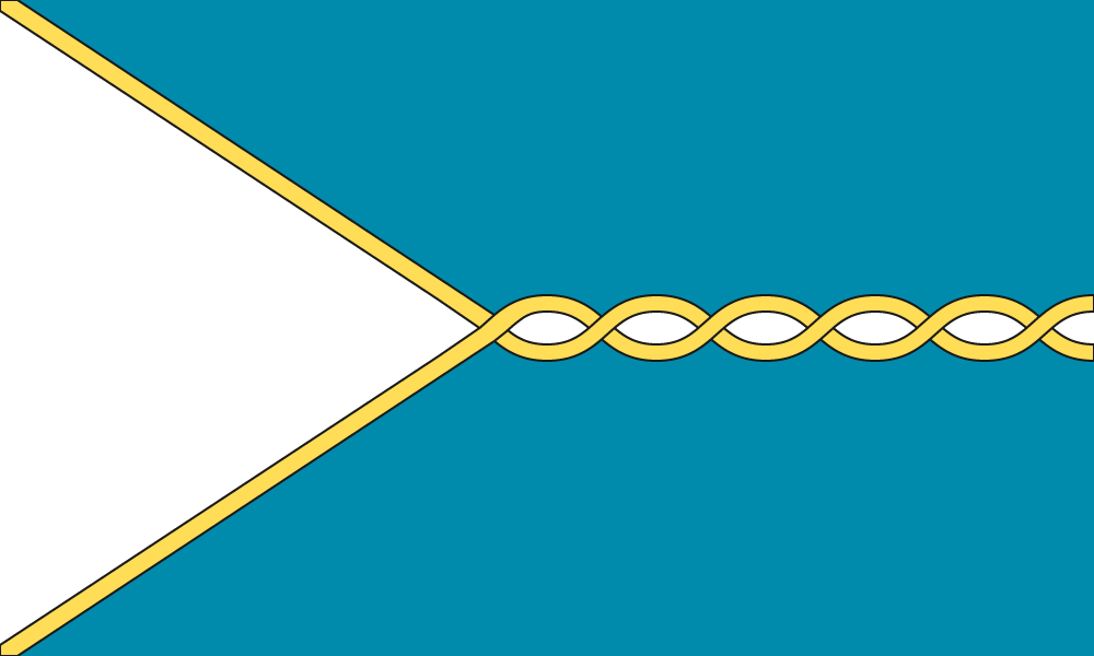Auf die Flagge von Nedersassonien war ich immer neidisch. Sie hat ein Format von 3:5 und ist horizontal geteilt. Die linke Seite ist vertikal in ein weißes Dreieck unterteilt, das an der Mastseite beginnt und in der Mitte der Flagge (11/25) spitz zuläuft. Der Rest der Flagge ist Türkis/Cyan (#008bad). Eine goldene (#ffdd56), gedrehte Kordel mit feiner schwarzer Kontur verläuft horizontal durch die gesamte Flagge. Sie beginnt als Umrandung des weißen Dreiecks und setzt sich dann als Zopf auf dem hellblauen Feld fort (1/10 der Gesamthöhe).